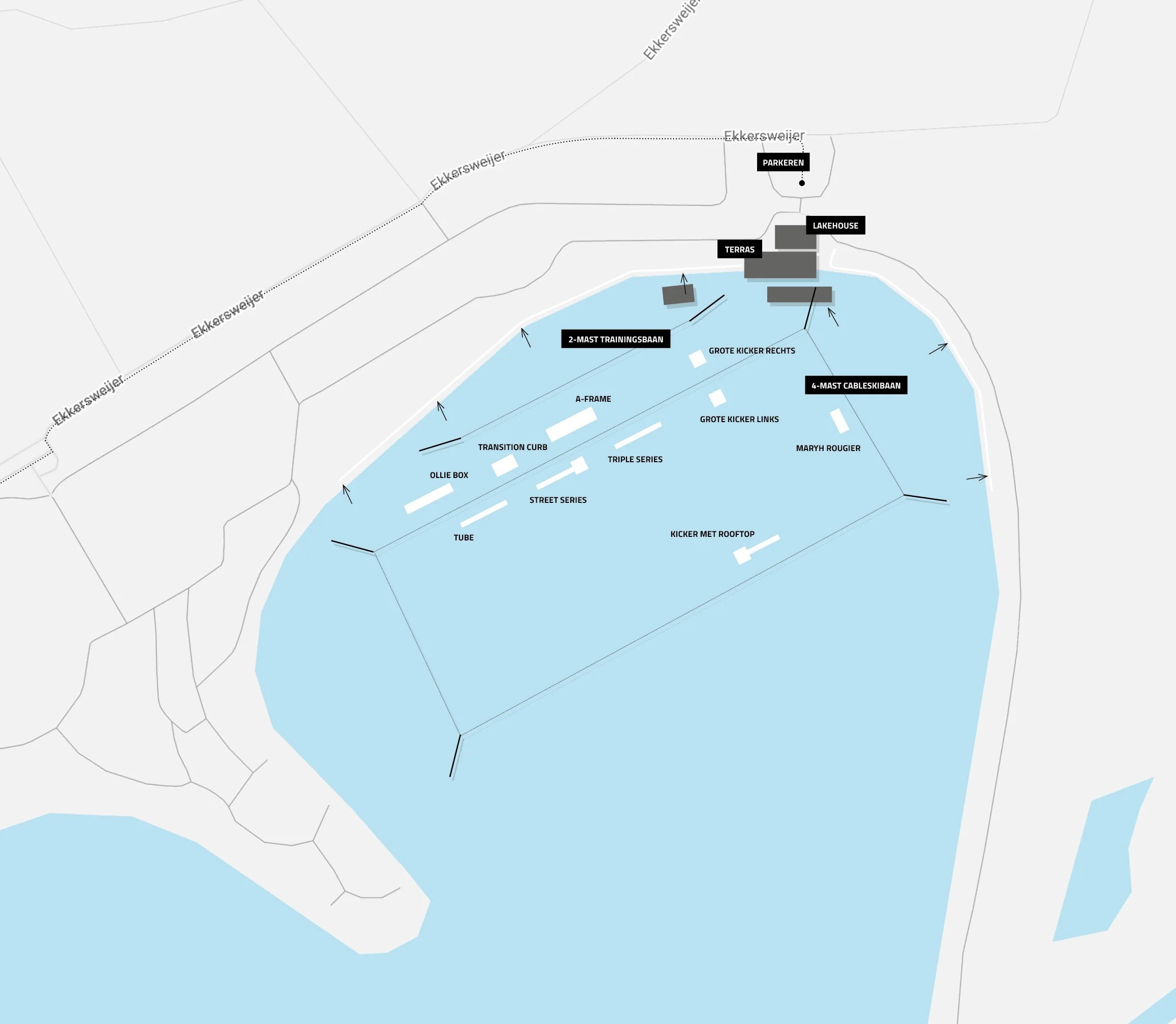 De cablebaan is ca 800 meter lang en heeft 10 aanhaakpunten (zgn ‘meenemers’). In het parcours liggen een aantal uitdagende obstacles om spectaculaire sprongen te maken. Onze instructeurs voorzien je graag van de nodige tips. Een stoere sprongstart vanaf het dock is makkelijker dan je denkt. Een waterfiguur (invert) vergt meer training, maar met de juiste begeleiding kun je snel progressie maken.